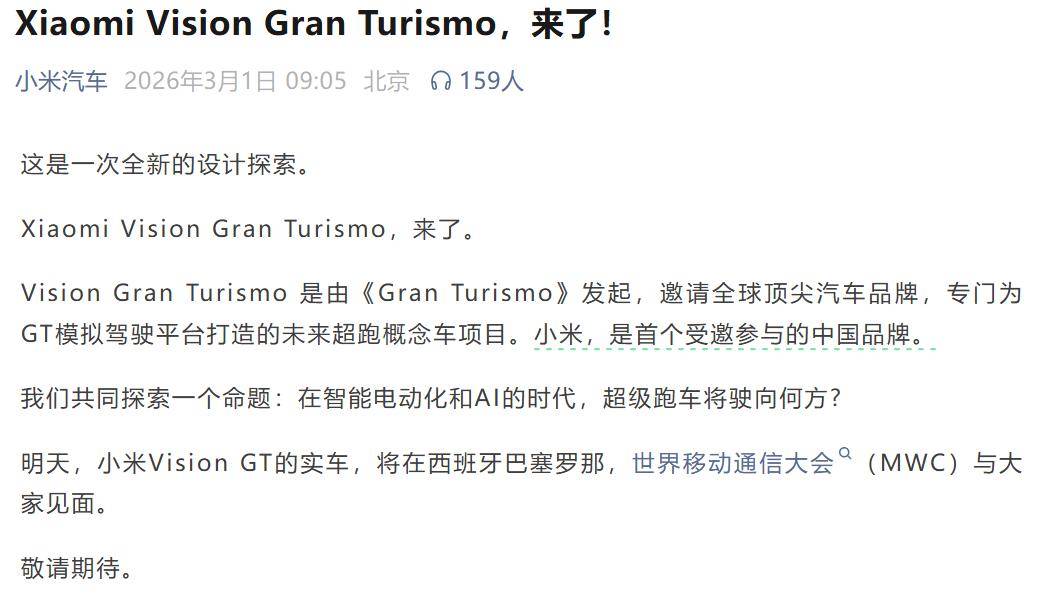 雷军在社交平台转发确认,小米Vision GT的实体模型将于西班牙巴塞罗那世界移动通信大会(MWC)首次亮相。这场科技盛会将成为连接虚拟与现实的桥梁,参观者可通过AR技术体验这款概念车在数字赛道上的动态表现。行业分析师指出,此举既展现了小米在汽车设计领域的创新实力,也为其后续量产车型积累了品牌势能。