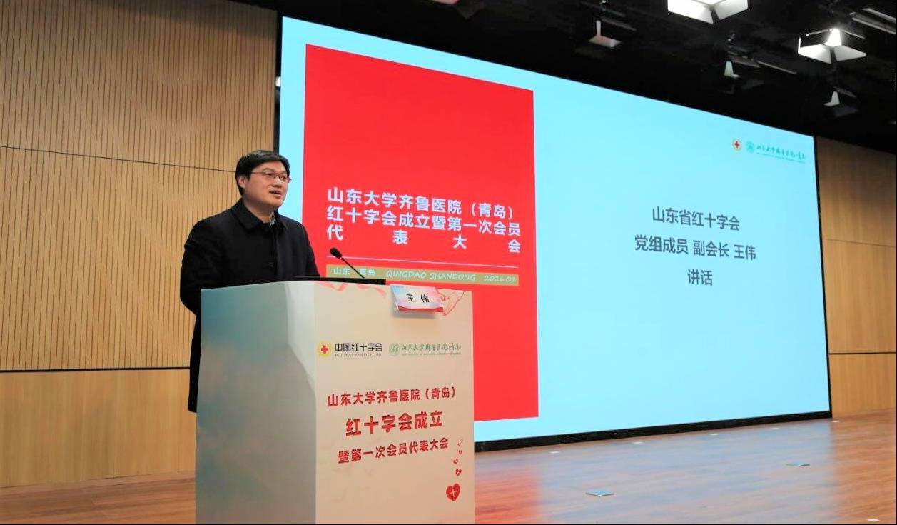 2026年1月13日上午,山东大学齐鲁医院(青岛)红十字会成立暨第一次会员代表大会在学术报告厅隆重举行。山东省红十字会党组成员、副会长王伟,青岛市卫生健康委党组书记、主任柳忠旭,医疗应急处处长徐大韬,青岛市红十字会党组书记、分管日常工作的副会长高嵘,党组成员、副会长马靖坤,事业发展部部长薛梅,驻青高校相关领导,以及山东大学齐鲁医院(青岛)院长高海东、副院长李建军等出席大会。医院150名会员代表共同参会,见证这一关乎医院公益事业发展的重要时刻。
